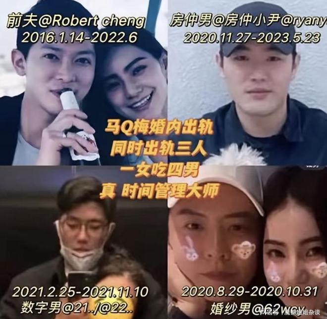 五是有网友整理出了马筱梅在2020年到2023年当中的出轨铁证。当时马筱梅和前夫还没有离婚,但她同时和3名陌生男子约会。有图有真相,可以说是证据确凿。